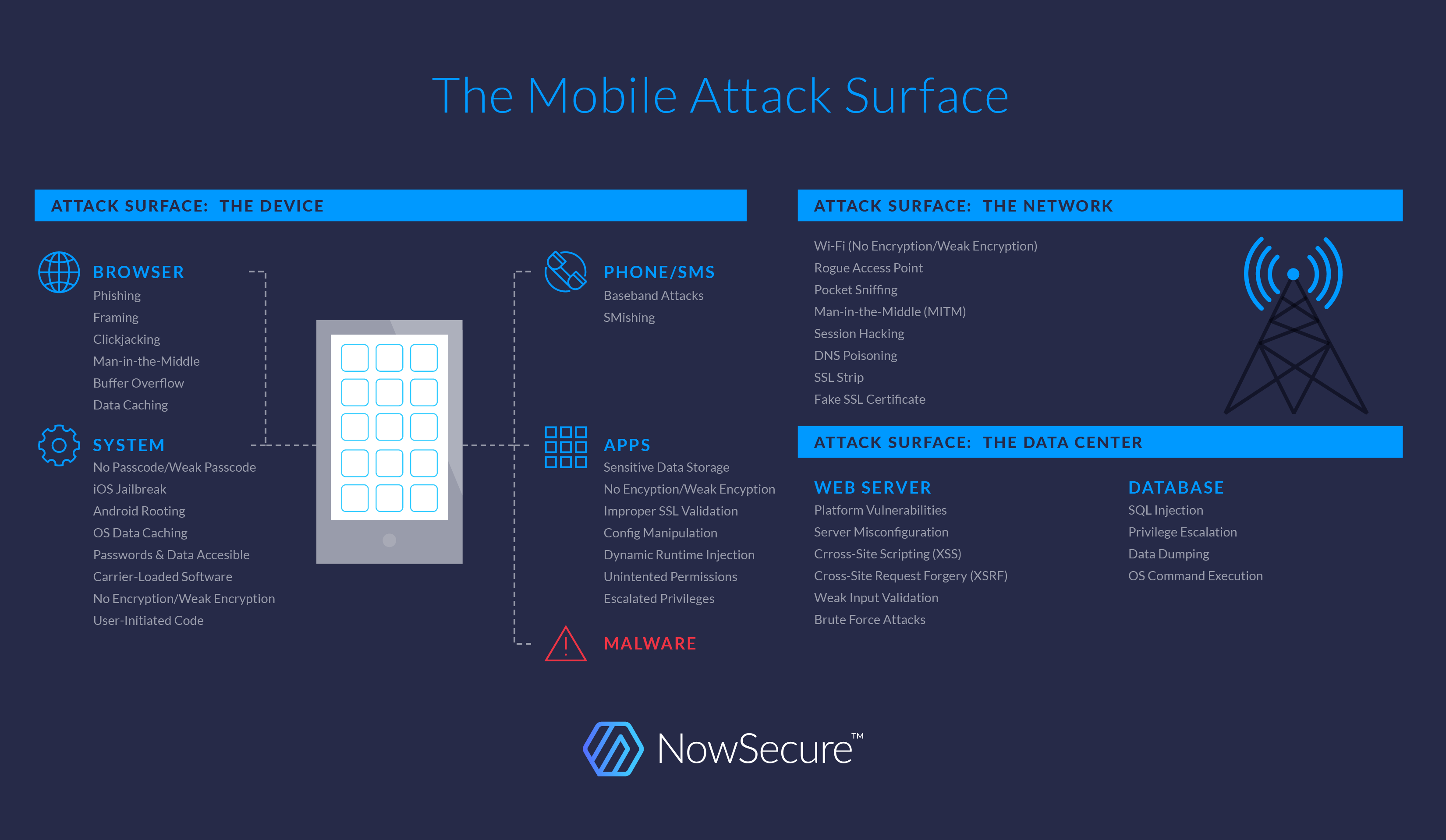 如下图所示,移动应用攻击包括设备层,网络层,数据中心,或以上所有。平台固有的漏洞与社会工程学持续为网络盗贼提供了机会,也为保护用户数据的人带来了重大挑战。